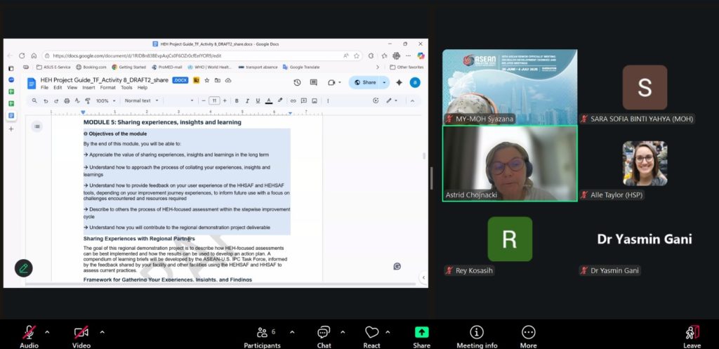 Susulan mesyuarat teras ASEAN–US IPC TF yang telah diadakan pada 4 September 2025, suatu mesyuarat secara dalam talian telah diadakan pada 10 Oktober 2025 bagi memuktamadkan nota konsep bagi pelaksanaan kajian rintis projek yang bertajuk “Implementation of Demonstration Pilot Project to Address a Key IPC Challenge” . Mesyuarat ini telah dihadiri oleh Unit Kawalan Infeksi BPP KKM, Pakar Perubatan Penyakit Berjangkit, Dr. Yasmin binti Mohamed Gani, US Centers for Disease Control and Prevention (US CDC), ASEC, serta HSP-TSEC.
