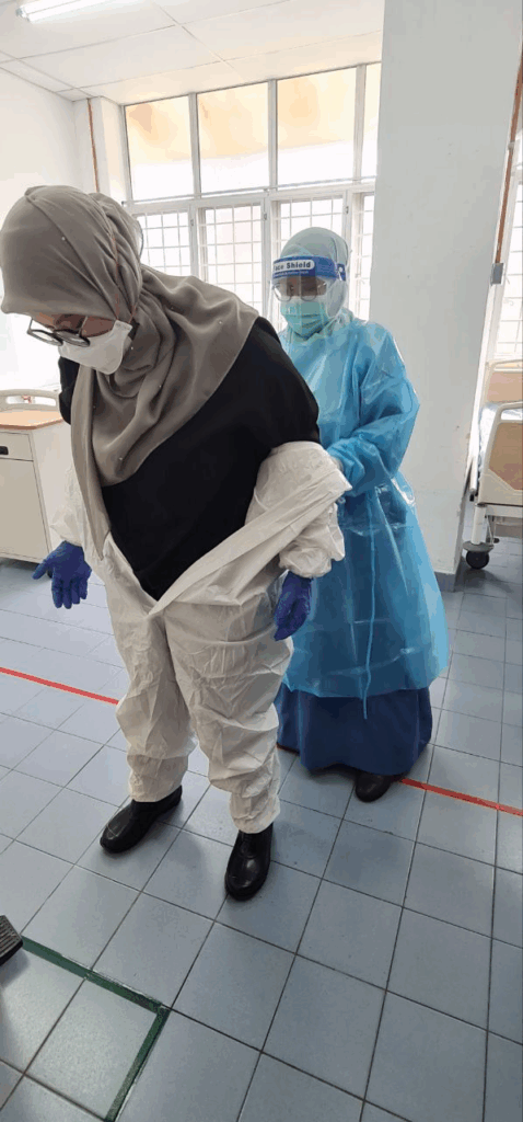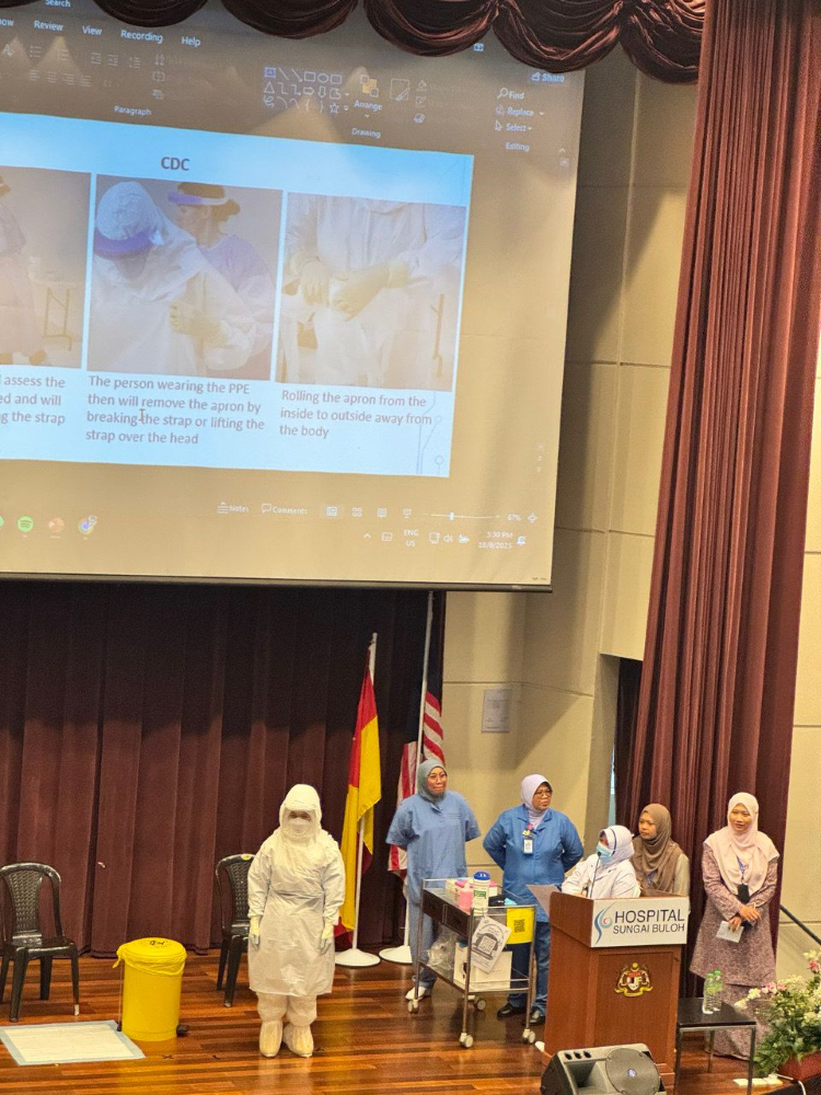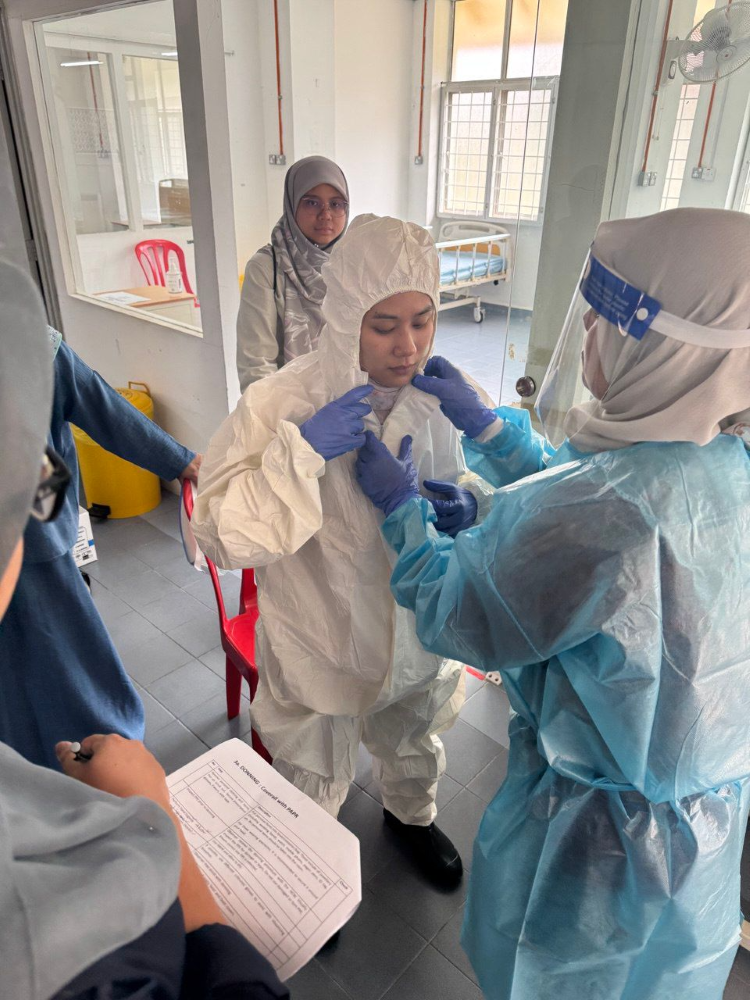 Pada hari kedua, peserta menjalani sesi praktikal bagi mengaplikasikan hasil perbincangan, khususnya dalam proses donning dan doffing PPE. Aktiviti ini bertujuan mengenal pasti kelemahan dalam prosedur sedia ada serta memastikan keselamatan petugas kesihatan semasa mengendalikan pesakit berjangkit berisiko tinggi.