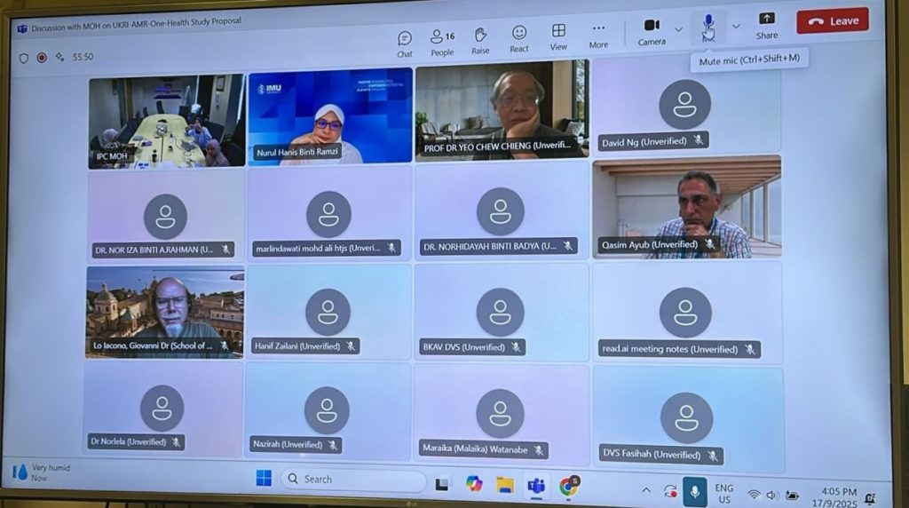 Unit Kawalan Infeksi, Cawangan Pengurusan Risiko dan Survelan Klinikal, Bahagian Perkembangan Perubatan selaku sekretariat utama National Antimicrobial Resistance Committee (NARC) beserta Sektor Kawalan Zoonosis, Bahagian Kawalan Penyakit telah menghadiri perbincangan secara dalam talian bersama pasukan penyelidik daripada IMU University, Universiti Sultan Zainal Abidin, UKM Medical Molecular Biology Institute, Monash University Malaysia, University of Surrey dan Brunel University London, bagi meneliti kertas cadangan penyelidikan pada 17 September 2025. Perbincangan ini telah turut dihadiri oleh wakil daripada Jabatan Perkhidmatan Veterinar, KPKM, Unit Mikrobiologi Hospital Sultanah Nur Zahirah dan Pakar Perubatan Pediatrik Penyakit Berjangkit, Hospital Tuanku Jaafar Seremban.