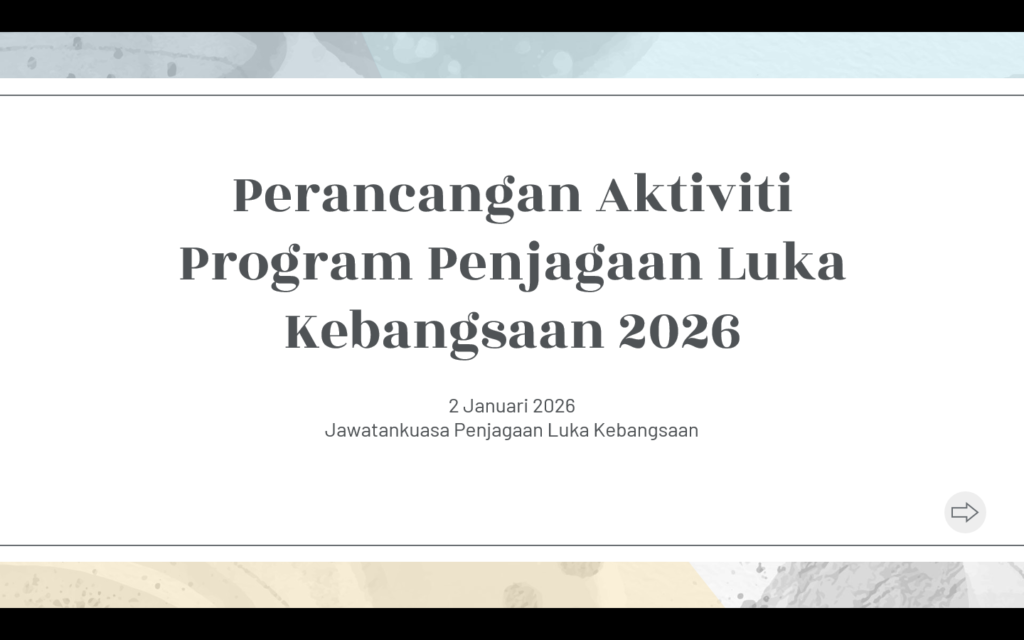 Hasil mesyuarat telah berjaya memuktamadkan pelan tindakan Program Penjagaan Luka Kebangsaan bagi tahun 2026. Diharapkan pelaksanaan aktiviti – aktiviti yang dirancang dapat memperkasa perkhidmatan penjagaan luka secara lebih komprehensif, inovatif dan memberi manfaat yang berterusan kepada pesakit serta sistem kesihatan negara.