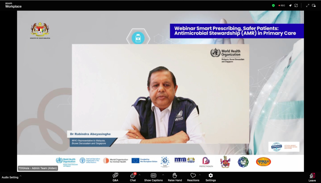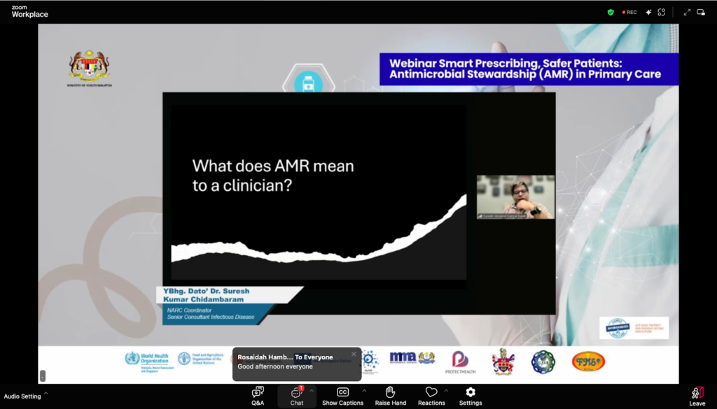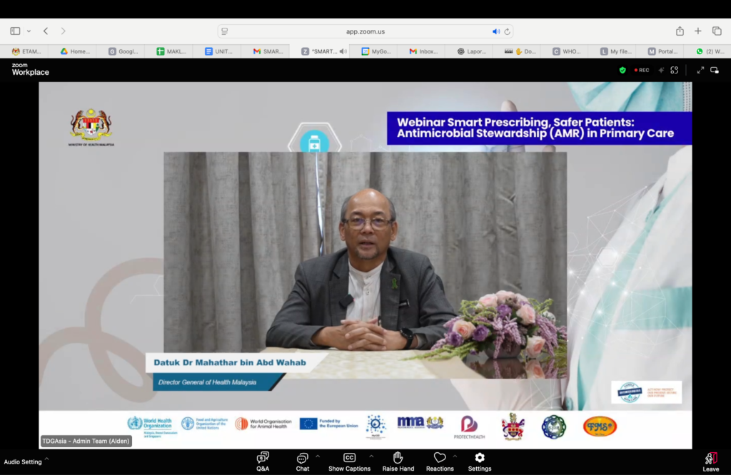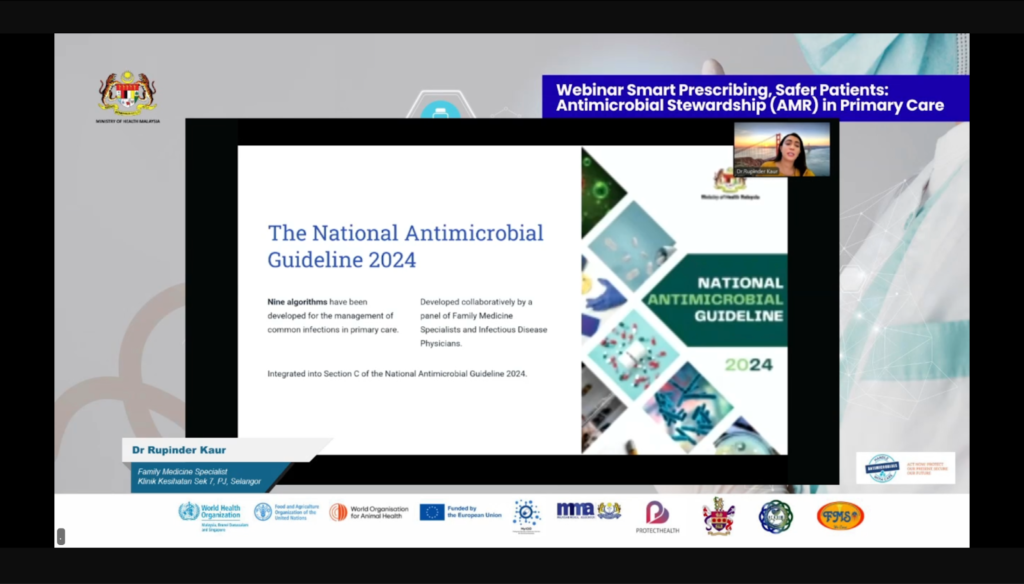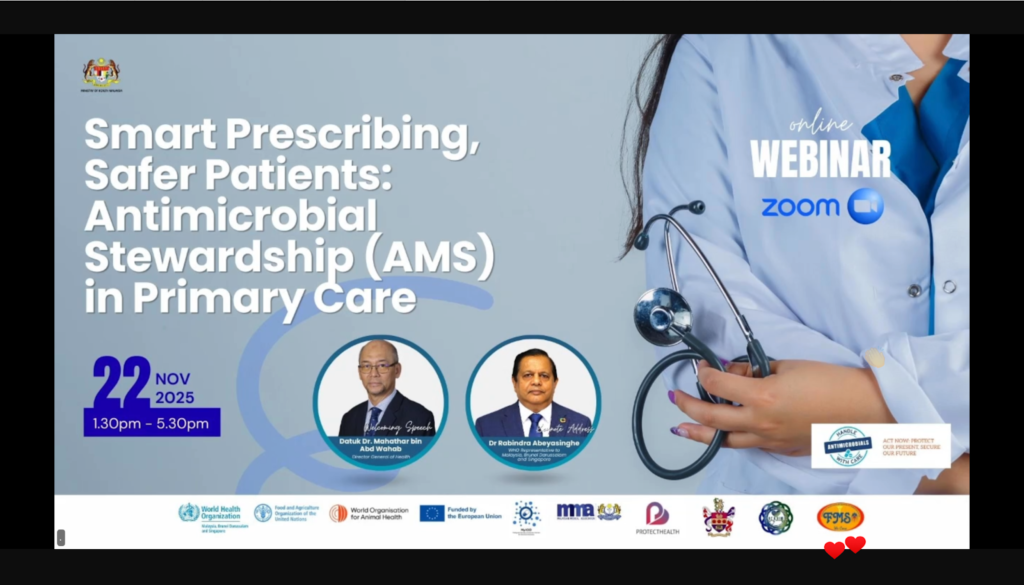 Sebagai salah satu aktiviti utama WAAW 2025, Unit Kawalan Infeksi, Bahagian Perkembangan Perubatan, dengan kerjasama World Health Organization (WHO), European Union (EU), Malaysian Medical Association (MMA) dan Malaysian Society of Infection Control and Infectious Diseases (MyICID), telah menganjurkan webinar “Smart Prescribing, Safer Patients: Antimicrobial Stewardship (AMS) in Primary Care” pada 22 November 2025 (Sabtu) melalui platform Zoom dan YouTube Live.