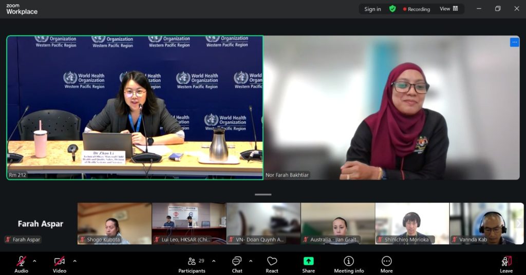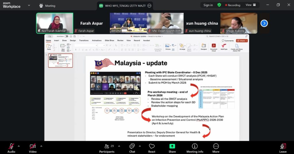 WHO Regional Office for the Western Pacific (WPRO) telah menganjurkan webinar “Post-workshop Reconnect and concrete progress updates” pada 10 Disember 2025. Webinar ini merupakan aktiviti susulan bagi bengkel Regional Workshop on Strengthening Infection Prevention and Control (IPC) in the Western Pacific Region yang telah diadakan pada September lalu dan dihadiri oleh Dr. Nor Farah binti Bakhtiar.